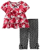 Baby birls printed cotton sateen tunic and printed cotton interlock legging set rose print multi ruffle tiers front and back short puff sleeve pearlized back buttons heart printed leggins full elastic waistband ruffles at ankle