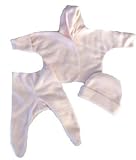 Very warm and soft!Light pink polar micro fleece jacket, pants and hat set.Hooded jacket with mitten cuffs,footed pants with velcro closure for easy on/off access, matching hat.Three premature infant and newborn baby sizes:small preemie 3-6 pounds;small infant 5-8 pounds andnewborn 8-12 pounds.By Jacqui's Preemie Pride