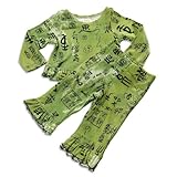 Psketti - Infant Girls Long Sleeve Pant Set, Olive Green, Allover Asian Graffiti Print, Ruffle Cuff Waist, Pull On Pant To Match, Full Elastic Waistband, Ruffle Cuff Hem, 93% Cotton 7% Spandex, Made In USA, #21554