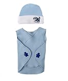 Adorable and So Soft.Opens flat, wraps around baby. Gentle against babies skin.Soft 100% cotton knit sleeveless wrap two velcro closures.Features overlapping front panels for easy monitor access,no interior seams, labeled for easy removal,adjustable for snug or loose fit andlonger in back for better coverage.Light blue wrap with puppy paw appliques on tabs.Light blue hat with white brim and blue puppy applique.Two sizes for premature babies.micro preemie for babies weighing 0-3 pounds andsmall preemies 3-6 pounds.Please select size when ordering.By Jacqui's Preemie Pride.