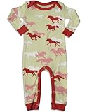 How cozy will your little one be in this long sleeve Wild at Heart Horse Print Coverall. Made of 100% Cotton in India, it has laptop shoulders and snaps from ankle to ankle. Wear to fit snugly for safety.